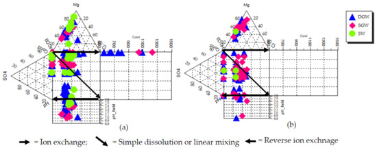 Moreover, an extended Durov plot was used to better explain the hydrochemical structure of groundwater in the study area (Figure 7a,b). These plots show that there was grouping in the chemical composition of all the water resources, particularly in the R-NO. There was medium and small dispersion in the chemical composition of DGW and SGW, respectively. The cations were grouped in the Mg2+ side and anions in the HCO3− side in all water resources, due to their high concentrations. This corroborates with the result revealed by the box-whisker and Piper diagrams on the predominant cations and anions.