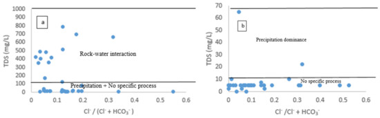 Regarding the chemical composition, it appears that a large charge imbalance between reported cations and anions could be due to using multiple instruments (two) for analyses of ions or/and the influence of dilute solutions such as rainwater. According to Fritz et al. [45], the samples prone to charge-balances of >10% are those with low ionic strength. This study applied a Durov plot, Gibbs plot, and ionic ratios to understand hydrogeochemical processes that regulate water chemistry. A Gibbs plot was also initiated in the framework of hydrogeochemical processes to evaluate the source of chemical constituents in groundwater [81]. The common hydrogeochemical processes given by Gibbs were atmospheric precipitation (TDS = 10–100 mg/L), rock–water interaction (TDS = 100–1000 mg/L), and evaporation (TDS = 1000–10,000 mg/L) [82]. In this study, just one of the two diagrams proposed by Gibbs (TDS vs. (Cl−/Cl− + HCO3−)) was plotted (Figure 8a,b) to represent groundwater samples in the watersheds of the R-NO and R-AD, respectively.
