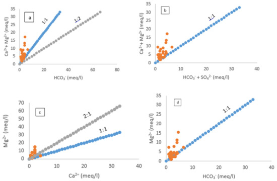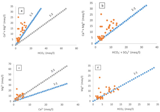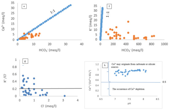Based on the hydrochemical data, the major ions’ relationship was plotted to explain the mechanism controlling the local groundwater in the R-NO (Figure 9a–h) and R-AD (Figure 10a–h).