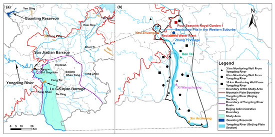 (a) Location map of the Yongding River ecological water supplement plains region (Beijing section). (b) Distribution map of the groundwater monitoring wells.
