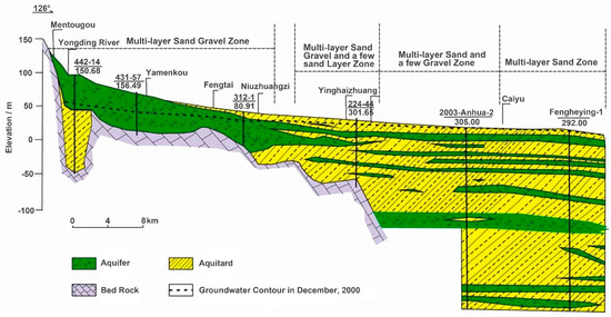 Hydrogeological profile in the Yongding River alluvial fan (adapted from Figure 2 in the study by Huan et al. [28]).