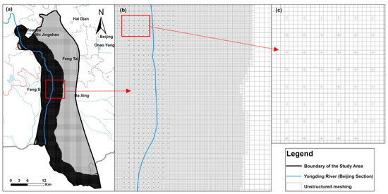 (a) Model quadtree grids division diagram. (b) Schematic diagram of a partial enlargement of the first-level encryption in a 3 km range along the Yongding River. (c) Schematic diagram of partial enlargement of secondary intensification of ecological water injection wells.