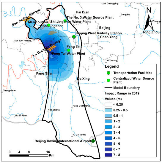 Combined with the obtained groundwater level rise variation map and the delineated groundwater level impact range, we analyzed the impact of the main typical buildings within the study area, such as the centralized water source plant, Beijing West Railway Station (BWRS), and Beijing Daxing International Airport (BDIA). The analysis was only limited to the analysis of the groundwater level around the typical buildings and did not involve the analysis of the impact on the structure of the engineering buildings. The same was true of the analysis in the following forecast for 2020. While the Fengtai water plant is within the delineated impact area, the impact of the ecological water supplement on it only caused the surrounding groundwater level, rising by 0.5 m. Such a small increase will give the centralized water source plant a few positive impacts. In addition, several typical buildings, including the Shi Jingshan water plant, the no. 3 water source plant, BWRS, and BDIA were excluded in the impact range of this ecological water supplement. Thus, the ecological water supplement would not cause a significant impact on them under this condition.