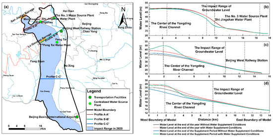 (a) Impact range of groundwater level restoration in the Yongding River supplement region in 2020. (b) Profile A–A’ water level change map for the upper reaches of the Yongding River. (c) Profile B–B’ water level change map for the middle reaches of the Yongding River. (d) Profile C–C’ water level change map for the lower reaches of the Yongding River.