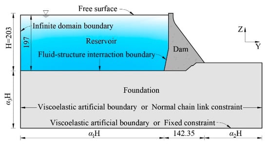 - Chen, D.; Hou, C.; Wang, F. Influences on the seismic response of the gravity dam-foundation-reservoir system with different boundary and input models. Shock. Vib. 2021, 2021, 1–15. [Google Scholar] [CrossRef]