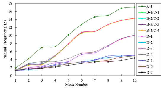 - The natural frequency of the dam decreases greatly in numerical analysis when the dam–foundation interaction is considered, and decreases slightly with the increase in the foundation size. The simulation methods of reservoir water have significant effects on the natural frequency of the dam, whereas the reservoir water lengths have no significant effect.