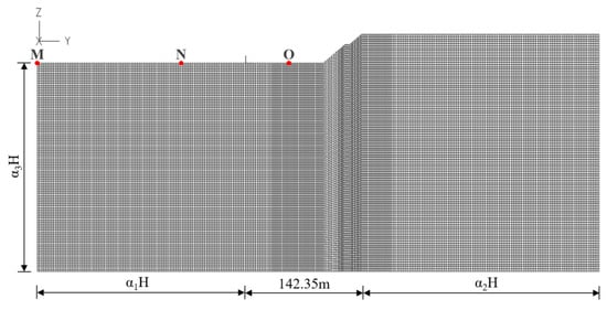 - The dynamic interaction of the dam and the foundation cannot be ignored. The radiation damping effect should be considered in the dynamic numerical analysis. The viscoelastic artificial boundary foundation is more efficient than the massless foundation in simulating the radiation damping effect of the far-field foundation. It was found that a foundation range of 3 times the dam height in all directions, such as upstream, downstream, and depth, is the most reasonable range of the truncation boundary of the foundation.