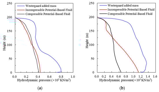 - The methods used for reservoir water simulation have no significant effects on the acceleration and displacement of the dam, but have a significant effect on the stress. Compared with the Westergaard added mass method, the potential-based fluid simulation method simultaneously takes into account the reservoir–dam and reservoir–foundation interactions. The static and dynamic water pressure was applied to the upstream foundation surface as the reservoir water, which may cause downward deformation of the foundation and consequently increase the normal tensile stress at the dam heel. It was found that a reservoir length of 3 times the dam height is feasible for the truncation boundary of the reservoirs.