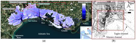 (a) The Marano and Grado lagoon in the northern Adriatic Sea, Italy: bathymetry data arising from the survey by Triches et al. [43] superimposed onto World Imagery satellite imagery (QGIS); (b) a detail of the regional cartography from 2003 of the Marano Lagunare area (http://www.regione.fvg.it/rafvg/cms/RAFVG/ accessed on 1 September 2021); the red rectangle delimits the area depicted in Figure 2.