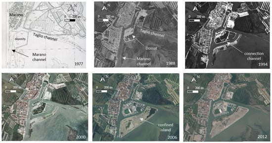 From a historical point of view, the port system of Marano has undergone a profound transformation over the last 40 years, related to the permanent siltation process, which requires periodic maintenance works. As shown in Figure 2, in front of the village in 1977 there was only an accumulation of deposits, probably deriving from the traditional ancient dredging of the Marano and Taglio channels. In 1988 an accumulation of deposits became an urbanized area called Dossat island, and in 1994 it appears in its current outline, including the new recreational port. Moreover, a new deposit area is clearly recognizable in front of Dossat island, which includes the islands that mark the Marano channel. In this way, a new canal that connects the Marano canal to the Taglio canal was formed, which is usually referred to as the connection channel.