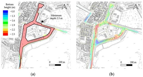 Consecutive surveys in the port: bottom height superimposed onto regional cartography from 2003. (a) Bottom height after the dredging works in 2015; the black line indicates the area where a minimum water depth of 2.5 m is guaranteed; (b) Bottom height in 2019.
