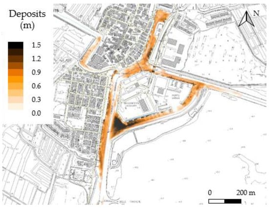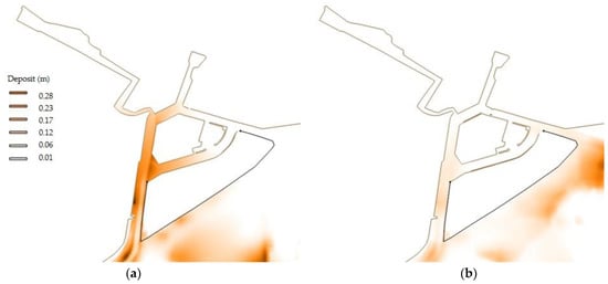 As a consequence, the average annual deposition in the port appears to be much more influenced by Bora events (Figure 12a), with a large silting of all channels, the only exception being the Taglio channel. On the other hand, Sirocco events are responsible for the siltation of the Taglio channel and make only a relatively small contribution to the sediment deposition in the Marano channel (Figure 12b). The sum of deposits of the Bora and Sirocco simulations gives only a distributed siltation inside the whole port as a result.