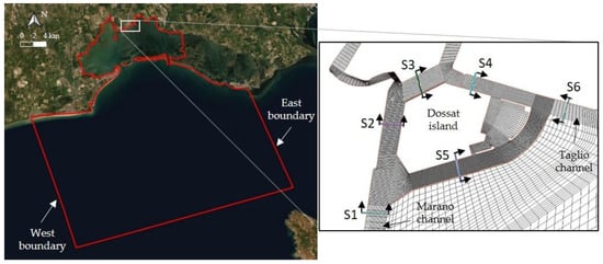 The choice of the computational domain is a key point in order to give a proper representation of the sediment input in the port. Even if the Marano harbor is relatively small, a larger area should be considered to give a consistent representation of the forcings that induce sediment movement. Petti et al. [38] showed that sediments in the lagoon are stirred up by the wave motion on the tidal flats and then driven by the tidal current along the channels. Moreover, preliminary studies showed that the water circulation inside the port is due to small differences in the water level and phase shifts at the entrances of the Marano and Taglio canals. Thus, the lagoon’s hydrodynamics should be represented in the best possible way. Petti et al. [68] suggest imposing tidal oscillations on a sufficiently large domain directly into the Adriatic Sea, to appropriately describe the hydrodynamic evolution of the tides on the tidal inlets, and hence within the lagoon. Additionally, initial tests showed that the hydrodynamics of the western part of the lagoon, where Marano is located, is mainly influenced by the Lignano, Sant’Andrea and Porto Buso tidal inlets, allowing for the reduction of the computational domain and disregarding the eastern part of the lagoon, with the aim of limiting the computational effort. With this in mind, the study should include a large part of, but not the entire lagoon, the most influent tidal inlets and a portion of the Adriatic Sea, as shown in Figure 5. Sediments delivered by nearby rivers have been neglected, because most of them are resurgence waters, with very low sediment transport [38]. The resulting mesh consists of about 216,000 quadrangular elements, with a size length ranging between 0.8 and 550 m. A detail of the port is depicted in Figure 5.