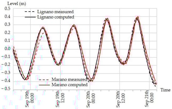 In addition to the validation process already conducted and presented in Petti et al. [38], the hydrodynamic model has been further verified by simulating a registered tidal oscillation and comparing the simulated and measured water surface levels at Marano’s and Lignano’s tidal gauges. The results are depicted in Figure 6, and they show a good agreement between numerical and observed data.