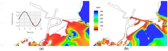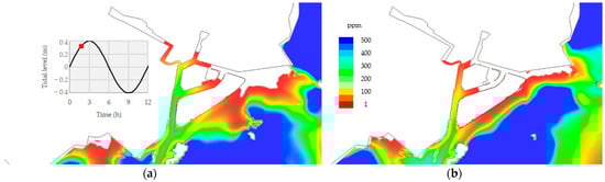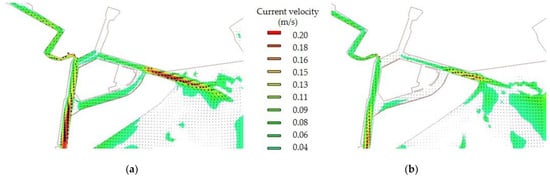 For a thorough understanding of the sediments and hydrodynamics inside the harbor, the numerical model was first applied to the mesh with the same bottom height, as it was just after the dredging operations of 2015 (Figure 3a), and this has been considered hereafter as the reference configuration. In particular, three simulations have been conducted, the first being characterized by tide only, with no wind, the second by tide and Bora wind (Figure 7a) and the third by tide and Sirocco wind (Figure 7b).