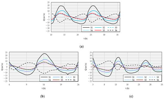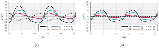 In all cases, velocities are very low in the area where the Marano channel crosses the connection channel, especially along the quay, and this condition causes the silting of suspended matter entering the port. This is also confirmed by the surveys, which show the largest deposition exactly in this area (Figure 4). The general evolution of the flow in the port is summarized in the hydrographs of Figure 9, where it can be observed that the discharge through the Marano channel (Section S1) is the largest in all simulations, while the flow through the Taglio channel (Section S6) is smaller and in the opposite phase. Moreover, a comparison between the Bora and Sirocco simulations (Figure 9a,b) highlights the different behavior of the Marano and Taglio channels under different wind conditions. In fact, the flow entering the S1 section is larger during the Bora simulation than during the Sirocco simulation. On the contrary, the flow entering the S6 channel is slightly higher during the Sirocco event than during the Bora event.