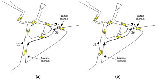 Sketch of the functioning of the Marano port as a hydraulic network during: (a) flood tide; (b) ebb tide.