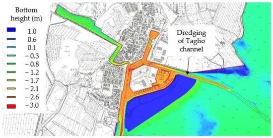 Manning roughness coefficients and the bottom height for the lagoon and the sea have been assigned as in Petti et al. [69], where the bottom height refers to the surveys conducted in 2009–2011 [43]. With reference to Manning roughness coefficients, the port channels were considered as lagoon channels, and the emerged artificial island in front of Marano was treated as dry land. The bottom height of the channels surrounding Marano was deduced from the post-dredging survey of 2015 (Figure 3a). The boundary conditions were assigned as in Petti et al. [68], imposing a tidal oscillation on the East and West sea boundaries and setting a reflective condition on all other boundaries. In this way, the influence of small rivers that flow into the lagoon was not taken into consideration, as they only influence the currents locally.