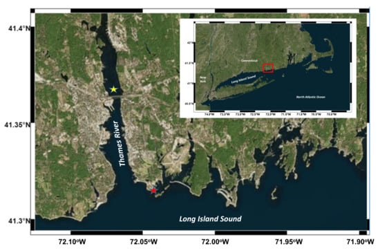 Long Island Sound (LIS) is a major coastal estuary in the northeastern United States and there are more than 20 million people living around the LIS. Due to its large population, LIS receives a large amount of waste inputs, including nutrients, OM, and pollutants. The large OM flux induces hypoxia in western and central LIS during summer seasons [21]. The Thames River is a short river about 25 kilometers in length with a strong tidal effect, which flows into LIS in eastern Connecticut.