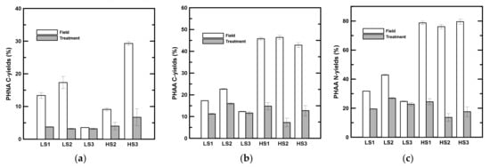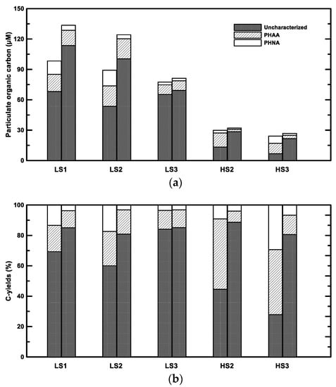 The C- and N-yields from PHNA and PHAA appeared in a wide range in the field. PHNA accounted for 3.5 to 29.3% of bulk POC, whereas PHAA comprised 17.3 to 46.4% of bulk POC and 24.7 to 79.6% of bulk PON (Table 4). Irrespective of the yields in the field, the particulate C- and N-yields decreased to a relatively narrow range in the treatment (3.2 to 6.7% in PHNA C-yields, 7.3 to 16.0% in PHAA C-yields, and 13.7 to 26.9% in PHAA N-yields; Table 4). Larger decreases of the C- and N-yields from the PHAA in high-salinity samples than those in low-salinity samples indicated that POM in high-salinity samples was more freshly produced and more bioavailable (Figure 2b,c).