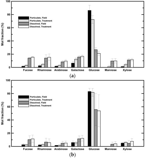 Field—The concentrations of seven neutral aldoses, including fucose, rhamnose, arabinose, galactose, glucose, mannose, and xylose were determined (Table 3). Glucose was the most abundant aldose in both low- and high-salinity samples (Figure 3). In low-salinity samples, glucose concentrations ranged from 0.37 to 0.51 µM in the dissolved phase (comprising 27 ± 3% of DHNA) and from 0.38 to 2.39 µM in the particulate phase (comprising 86 ± 8% of PHNA; Table 3, Figure 3a). In high-salinity samples, glucose concentrations ranged from 0.26 to 3.42 µM in the dissolved phase (comprising 56 ± 24% of DHNA) and from 0.26 to 0.36 µM in the particulate phase (comprising 83 ± 5% of PHNA; Table 3, Figure 3b). Galactose was the second predominant neutral aldose, comprising 14 ± 4% of DHNA and 6 ± 2% of PHNA (Figure 3). Fucose was also abundant in the dissolved phase (14 ± 1% and 15 ± 1% of DHNA in low- and high-salinity samples, respectively; Figure 3). In brief, hydrolysable neutral aldose accounted for 4 to 29% of POC and 2 to 15% of DOC (Table 5). There was a statistically significant difference in the mol fraction of neutral aldose between the dissolved and particulate phases in both low- and high-salinity samples. In general, the mol fraction of glucose in the particulate phase was higher than that in the dissolved phase in both low- and high-salinity samples (t-test, p < 0.05). In contrast, the mol fractions of fucose and galactose in the dissolved phase were higher than those in the particulate phase (t-test, p < 0.05).