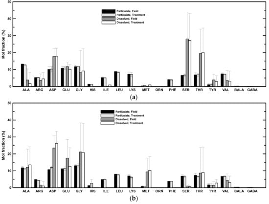 The amino acid mol fractions in the treatment had similar distributions as field mol fractions in both low- and high-salinity samples, i.e., there was no significant difference in the amino acid mol fractions in the particulate and dissolved phases in either low- or high-salinity samples (Figure 4). Alanine, aspartic acid, glutamic acid, and glycine were still the dominant species in the particulate phase after two days of rolling. These four major amino acids accounted for 46 ± 3% and 48 ± 3% of the PHAA and showed no significant difference from samples in the field. Similar to amino acid mol fractions in the field, aspartic acid, glutamic acid, glycine, and threonine were still the major amino acids in the dissolved phase after rolling, comprising 37 ± 30% and 53 ± 11% of the DHAA in low- and high-salinity samples (Figure 4). Serine was the most abundant in low-salinity samples (Figure 4a), whereas alanine and methionine were relatively abundant in high-salinity samples (Figure 4b).