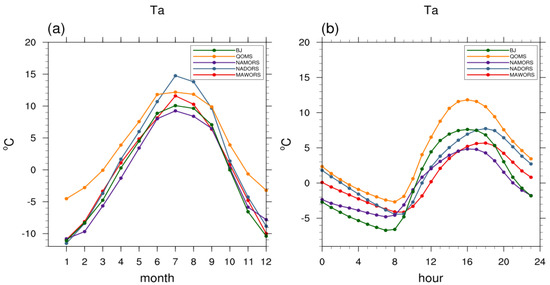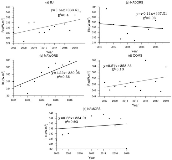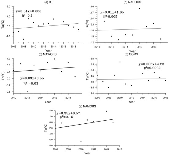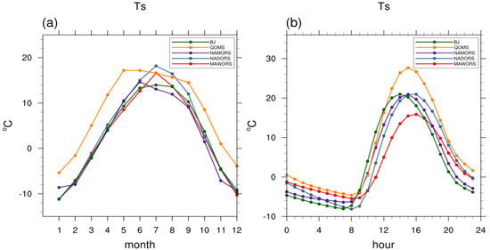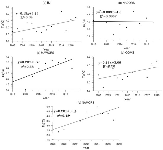 - The surface temperature at BJ, MAWORS, QOMS, NAMORS, and NADORS showed an increasing trend from 2013 to 2019. The annual variation of surface temperature at each station generally followed the changes in net radiation. The diurnal variation at each station was generally consistent with changes in upward longwave radiation and slightly lagged the downward shortwave radiation. The southernmost station (QOMS) had the highest surface temperature, and the northernmost station (MAWORS) had the lowest surface temperature.