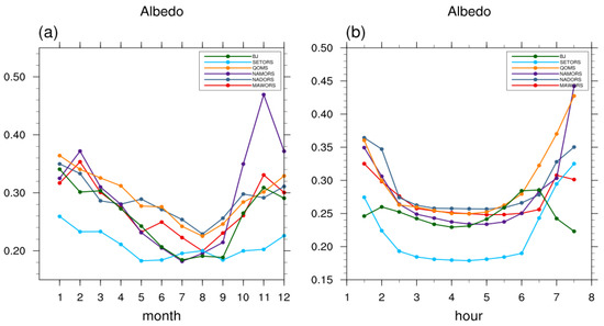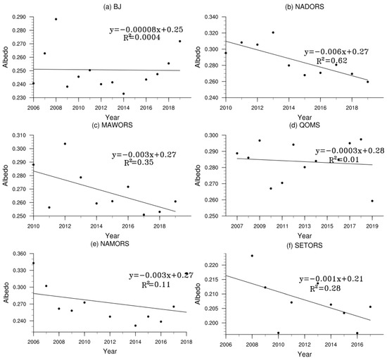 - The surface albedo at each station was decreasing year by year due to stronger vegetation growth under global warming. The annual change in surface albedo at each station followed a “U” shape. In winter, the ground was frozen, and the surface albedo was large. During the plant growth period from May to September, the surface albedo was small and showed little change. The daily variation of surface albedo at each station was also “U” shaped. The grass height at SETORS can reach 30 to 40 cm in summer, thus, here, the surface albedo was the smallest of all the stations.