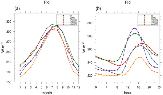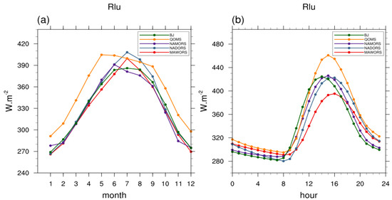 - The diurnal pattern of net radiation generally followed downward shortwave radiation. It showed positive values from 8:00 to 20:00 (range from 0 to 500 W·m−2). Moreover, diurnal variations in upward shortwave radiation were similar to those of downward shortwave radiation. Diurnal variations in upward longwave radiation show a peak between 15:00 and 16:00, slightly lagging the peak in downward shortwave radiation. The daily variation of downward longwave radiation at each station was small, ranging from 220 to 295 W·m−2.