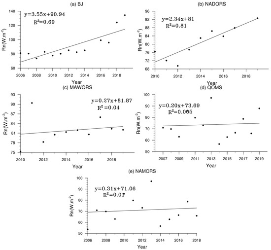 - The net radiation at each station (except SETORS) showed an increasing trend year by year. Although the upward longwave radiation at BJ, NADORS, MAWORS, QOMS, and NAMORS showed an increasing trend from 2013 to 2019, the downward longwave radiation also increased. Although the downward shortwave radiation at BJ and QOMS showed a decreasing inter-annual trend, probably due to an increase of cloudiness. The upward shortwave radiation increased due to decreasing downward shortwave radiation and increasing vegetation cover. Although the inter-annual downward shortwave radiation at NADORS and NAMORS fluctuated and decreased year by year, respectively. The upward shortwave radiation increased. At MAWORS, the downward shortwave radiation increased due to decreasing cloudiness and upward shortwave radiation decreased due to increasing vegetation cover.