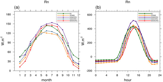 - The net radiation of each station is maximum in summer and minimum in winter. In summer, although the downward shortwave radiation at BJ, NADORS, QOMS, and NAMORS was slightly lower than that in spring (under the influence of monsoon), the upward shortwave radiation was lower than that in spring. The net radiation decreased with the declining total solar radiation in autumn, reaching an annual minimum in winter.