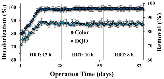 3.3. CR and COD Degradation by Coupled Biological-ECH Systems