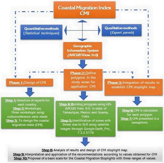 The development of the CMI was based on the use of statistical techniques, a geographic information system (ARCGIS View. 9.0), and consultations with expert panels. SLR was estimated with existing data. Available data allowed us to adjust the CMI to the specific conditions of each country, including hydrodynamic and high-resolution terrain-elevation models [44,45,46]. This research was carried out in three phases: (1) design of the CMI; (2) definition of polygons in the study area for application of the CMI; and (3) integration of results for establishing a CMI stoplight map in the test areas (see Figure 1).