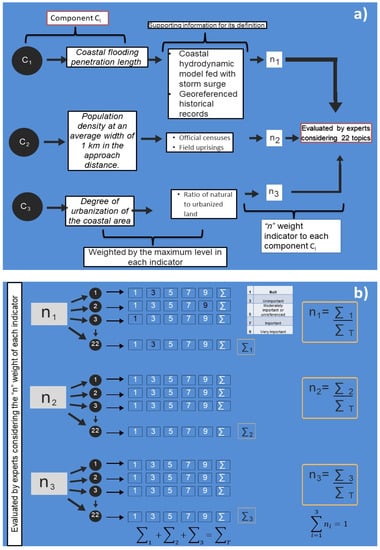 Methodological process for the construction of the CMI. Caption: (a) components C1-C2 and C3 to evaluate the impact of sea level rise on coastal settlements. (b) 22 indicators were the result of the weighting calculus done by experts.