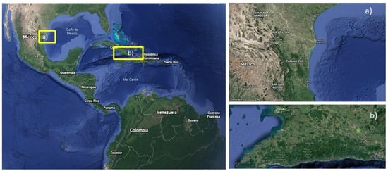 Study area for the application of CMI. Caption: (a) Tamaulipas State, Mexico. (b) Guama Municipality, Province of Santiago de Cuba, Cuba.