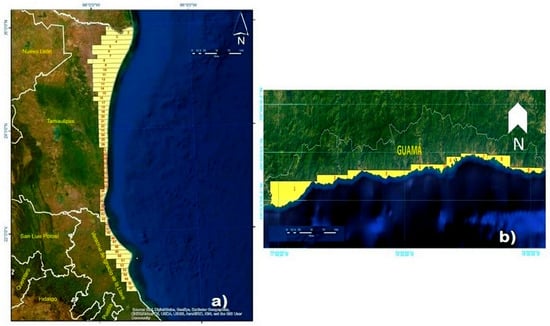 Each polygon has a constant coastal width of 10 km and a varied length of landward penetration delimited by land elevation according to the maximum topographic height that flooding processes could reach in the study area. To do this, the sum of the sea level rise due to effect of wind, waves, atmospheric pressure, and the historical semi-amplitude of the tide in each place is considered. This is the highest value assumed by the tide, registered in a period after the occurrence of hurricanes and other natural events, such as gales and storms. This upper limit is derived from the expectations for a category V hurricane on the Saffir-Simpson scale [19,20]. The approximate maximum altitude above mean sea level is 10 and 5 m for Mexico and Cuba, respectively. We also considered the geomorphological characteristics present in each coastal territory.