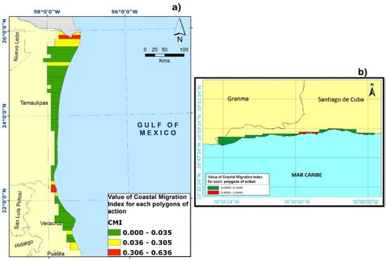 The Coastal Migration Index (CMI) is calculated for each polygon by applying the aforementioned integrated formula. The interpretation ranges for each action to be implemented are determined according to the scale of low, moderate, or high-risk scenarios. Generally, in these ranges, the numerical position that the index values occupy in different polygons is considered with respect to the lower or intermediate limits, as appropriate. In the entire class of data corresponding to the CMI by polygons, the minimum non-zero value was selected, which is assumed as the lower limit (Xmin). It was also necessary to obtain the intermediate limit (Xmed). For this, the maximum limit (Xmax), was determined as the highest value in the class of data under analysis, and the arithmetic mean of the minimum and maximum limits was calculated [Xmed = (Xmin + Xmax)/2].