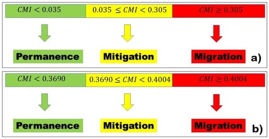 Ranges for the actions to be implemented are determined according to the low, moderate, or high-risk scenarios, linking them to: REMAIN ON THE SITE (green traffic light) when the risk is low; MITIGATION (yellow traffic light) when moderation of risk requires mitigation measures (such as coastal walls, hydraulic infrastructure against floods, early warning systems, among other actions); and MIGRATE (red traffic light) in the face of high risk that would mainly force the relocation of human settlements or not allow them to expand in such conditions. The result of applying the CMI is expressed in a semaphore. As mentioned, the CMI establishes three scenarios: permanence (low risk), mitigation (moderate risk, allowing staying in a place with appropriate actions), and migration (high risk requiring relocation) (Figure 3).