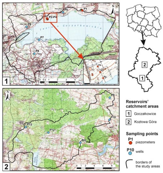 During a field campaign in August 2019, 13 groundwater samples were collected within two study areas: eight samples in the catchment of the Goczałkowice reservoir and five samples in the catchment of the Kozłowa Góra reservoir (Figure 1). Samples were taken from four piezometers and nine private wells, the depth of which varied from 3.25 m to 30 m. The piezometers are situated to the north of the Goczałkowice reservoir catchment and belong to the monitoring network created for the ZiZoZap project —an integrated system supporting the management and protection of water reservoirs [33,36]. The details of all sampling points are presented in Table 1.