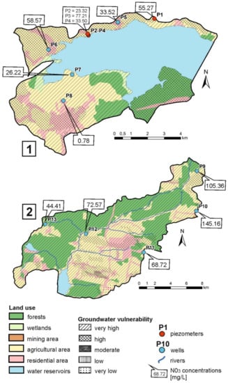 It is worth recalling that, in general, agriculture is considered to be the main pollution source of nitrates, since it accounts for 70% of the excessive amounts of NO3− in groundwater [27]. Nonetheless, the absence of a sewage system in some parts of the catchments may also be connected with the high concentration of nitrates. In addition, a certain amount of NO3− ions may be introduced to groundwater through leaking septic tanks [51]. Hence, groundwater quality may be affected by agricultural areas alone or by both agricultural and residential areas [33]. In such areas, the correlation between nitrate concentration and the occurrence of pesticide is not always apparent [14].