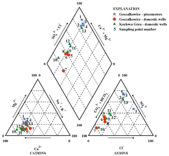 Generally, the results of chemical analyses indicated high concentrations of nitrates, especially in groundwater within the Kozłowa Góra catchment, where NO3- concentrations reached up to 145.16 mg/L (P10; Table 3). In the Goczałkowice area, the highest concentration of nitrates was 77.21 mg/L (P3; Figure 2). The concentration of nitrites in the study areas was significantly lower (up to 0.30 mg/L in P5 in the Goczałkowice catchment and up to 1.15 mg/L in P11 in the Kozłowa Góra area). In two samples collected from domestic wells in the Goczałkowice area, ammonium ions were detected (1.76 mg/L in P5 and 0.44 mg/L in P8). These results point to the different redox conditions in the Goczałkowice catchment (oxic conditions in the northern part and reducing conditions in the south) [33]. Nevertheless, slightly reducing conditions were encountered only locally, and nitrates were the most abundant of the inorganic nitrogen compounds in groundwater within the studied catchments.
