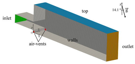 The boundary conditions are presented next. At the inlet, the velocity (V0) is 9 m s; the pressure is automatically calculated to assure the flux. The characteristic turbulent mixing length is m (). At the top, outlet and air vents, a total pressure condition is defined. At the outlet, the velocity condition is zero gradient for outflow, and the inflow is blocked. Both top and air vents have a binary velocity condition: zero gradient for outflow and exclusive pressure-driven normal air inflow. Turbulence for the previous three boundaries is zero gradient for outflow and for inflow m s, m s and s, considering a turbulent mixing length equal to the channel width (0.25 m) and an intermediate turbulent intensity of 0.05. Walls have no-slip tangent velocity and a turbulent wall function for the roughness of m, as described in the physical modeling. Due to the absence of specification of the inflows’ turbulence intensity (TI) in the physical modeling, two values were tested: and . In the complete two-phase Euler, the temperature of the fluids is intended to be 300 K ( °C). Hence, the initial temperature of the domain and the inflow temperature are set to 300 K, and the walls have a zero-gradient condition.