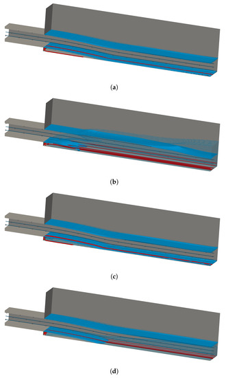 3D flow—surface (, solid blue), interface region (, transparent blue), air vents streamlines (red), water inlet streamlines (dark-blue) (, except for CTPEk–mixture). (a) TPVoF, k–. (b) CTPE, k–mixture. (c) TPVoF, k–SST. (d) CTPE, k– SST Sato.
