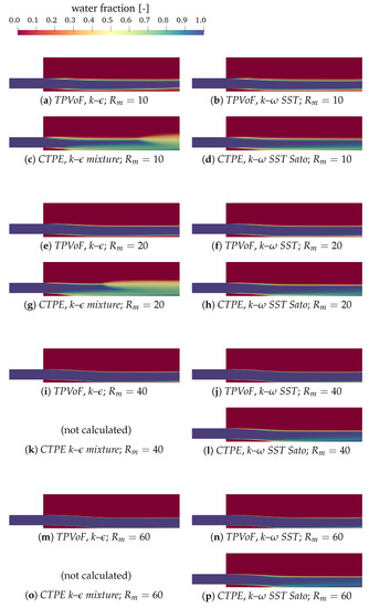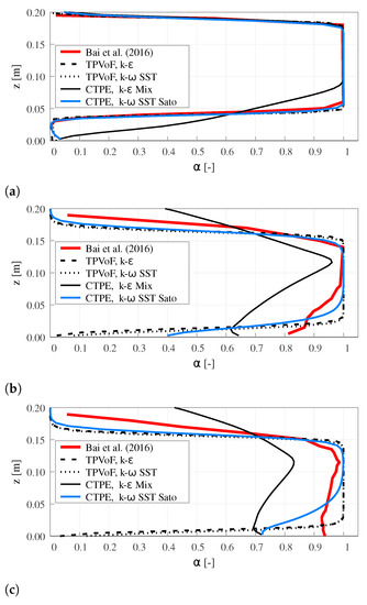 Better behavior is found in the CTPE with k– SST Sato. The mixed flow region is located in the lower half of the flow, sharing some similarities with the water fraction (α) profiles of Bai et al. [11]. However, at the bottom, in the cavity zone , and in the impact zone , which is considerably inferior to the reference profile, where α is 0.8 and 0.92.