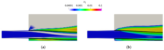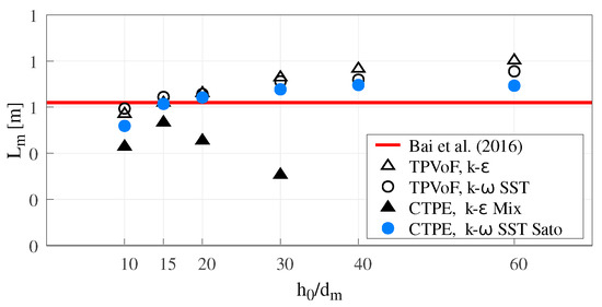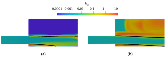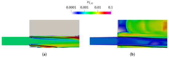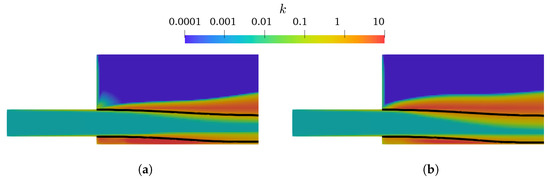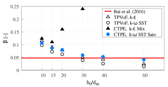The CTPE with k– SST Sato presents acceptable results for higher mesh resolutions (), converging to a lower-nappe aeration slightly inferior to the reference value. Oppositely, the CTPE with k– mixture reveals an unexpected increase of β for , becoming even more abrupt for higher mesh resolutions. This behavior can be explained by the concept of the k– mixture turbulent model and is addressed in Section 3.5.