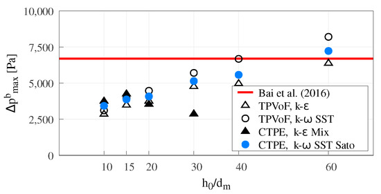 The following numerical settings are used: Euler time derivative; gradient is Gauss linear with multi-directional cell limiter ; the divergence scheme is linear-upwind for velocity. For turbulence fields, i.e., k, ϵ and ω, the divergence scheme is upwind. Regarding the TPVoF model, interface compression is based on a generic limited scheme for the divergence of α and an interface compression coefficient (Cα) of . For the CTPE model, among the available closures, the following models were used: Schiller and Naumaan [66] for drag, Ranz and Marshall [67] for heat transfer, Tomiyama et al. [68] for lift and the turbulent dispersion method based on Burns et al. [52] and Otromke [53]. This study applies a hyperbolic blending function that considers the fluid continuous if the phase volume-fraction value is larger than 0.6.