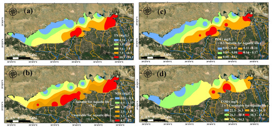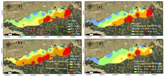 WQPs spatial distribution maps of in 2018: (a) total nitrogen (TN), (b) ammonium (NH4+), (c) orthophosphate PO43−, and (d) chemical oxygen demand (COD).