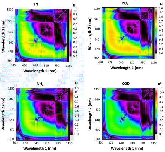 Correlation matrices showing the determination coefficients (R2) values for potential combinations of each wavelength from 302 to 1148 nm with total nitrogen (TN), ammonium (NH4+), orthophosphate (PO43−), and chemical oxygen demand (COD) over two years.