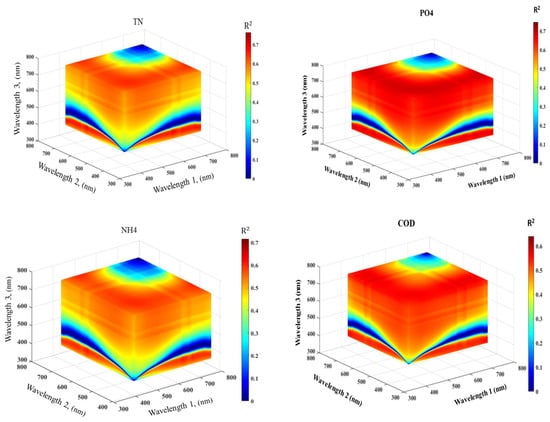 Three-dimensional slice map of the determination coefficients (R2) values that were obtained for the relationship between total nitrogen (TN), ammonium (NH4+), orthophosphate (PO43−), and chemical oxygen demand (COD) over two years that was calculated for all potential combinations of each three-band from 390–750 nm.