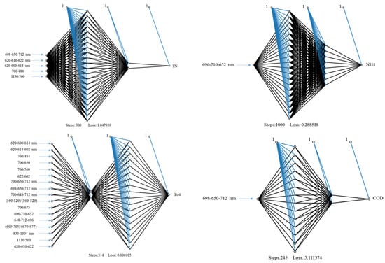 The ANN model was optimized by selecting the best hyperparameters (number of neurons in two hidden layers, and activation function). Generally, the spectral indices of three SRIs groups were fed randomly to the model in the first loop, the low-level features were dropped during each loop, and the superb features were organized in an ascending order concerning the highest contribution. During looping, the best hyperparameters were adopted, and the rest were excluded. Subsequently, the ANN outputs were compared to identify high-ranking variants and superior hyperparameters at minimum RMSECV that could improve the prediction of WQP. More details about the CODs can be found in Table S1.